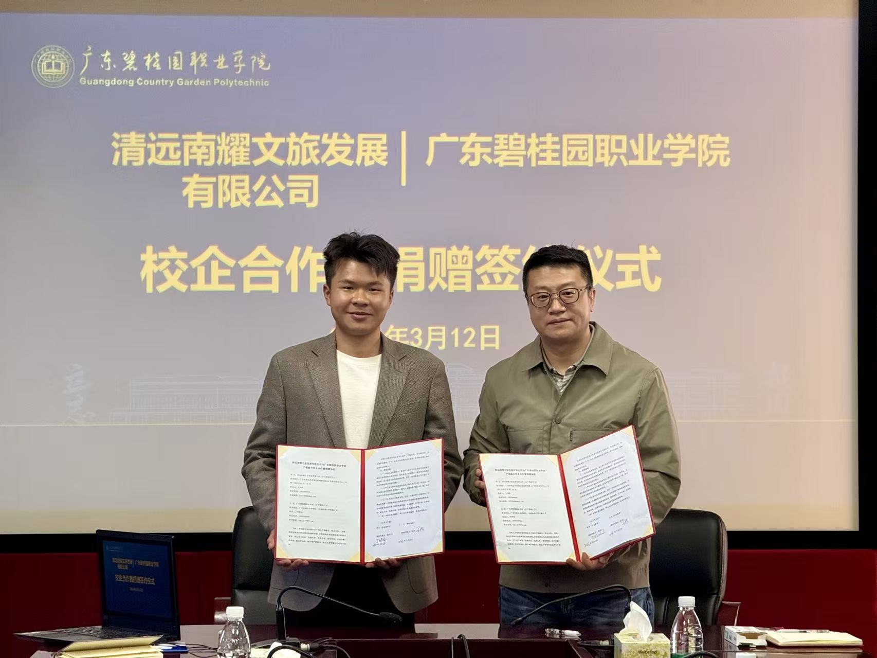 3月12日下午,清远南耀文旅发展有限公司总经理王鸿凯、副总经理李福澎一行莅临我校,围绕产教融合、协同育人等议题与我校开展深入交流,并现场签署了产教融合校企合作暨捐赠协议。企业向学校捐赠一批紫花风铃树,以绿意添彩校园、以匠心滋养育人。此次签约标志着双方合作进入实质性推进阶段,为今后在人才培养、项目共建、社会服务等领域的深度协作奠定了坚实基础。